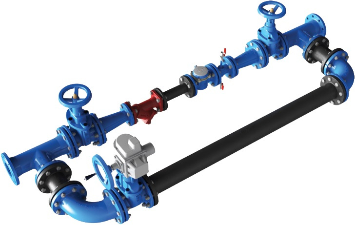 Узлы с обводной линией применяются в системах водоснабжения имеющих один водопроводный ввод. Такая схема используется так же в том случае, когда водосчетчик не рассчитан на пропуск воды для экстренного пожаротушения. В этих узлах запорная арматура устанавливается таким образом, чтобы обеспечить отсекание измерительного прибора. Это позволяет производить его замену или проверку водосчетчика, не ограничивая конечных потребителей в водоснабжении.