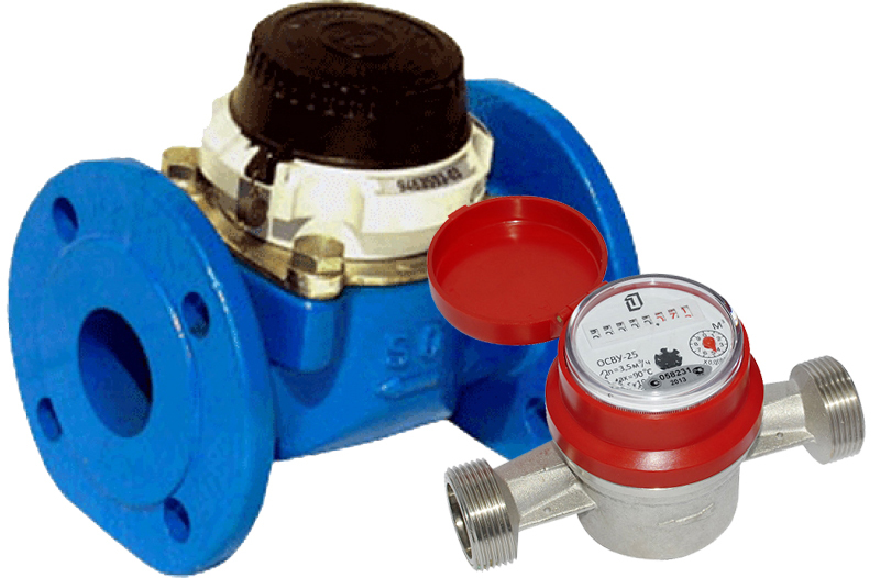 Для измерения расхода воды, как правило используются тахометрические счетчики двух типов: турбинныме и крыльчатые. По существующим нормативам, крыльчатые счётчики монтируются только на горизонтальных участках трубопроводов имеющих резьбовое соединение. Турбинные счетчики имеют фланцевое присоединение к трубопроводу и могут монтироваться как на горизонтальных, так и на вертикальных и наклонных участках трубопровода. Диаметр условного прохода (ДУ) крыльчатых водосчетчиков может быть от 15 до 50 мм.; турбинных – от 50 мм. и более.